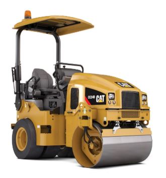 The Caterpillar CC2.6 is a tandem combination roller designed for soil and asphalt compaction. It features a steel drum at the front and four rubber tires at the rear for versatile compaction.